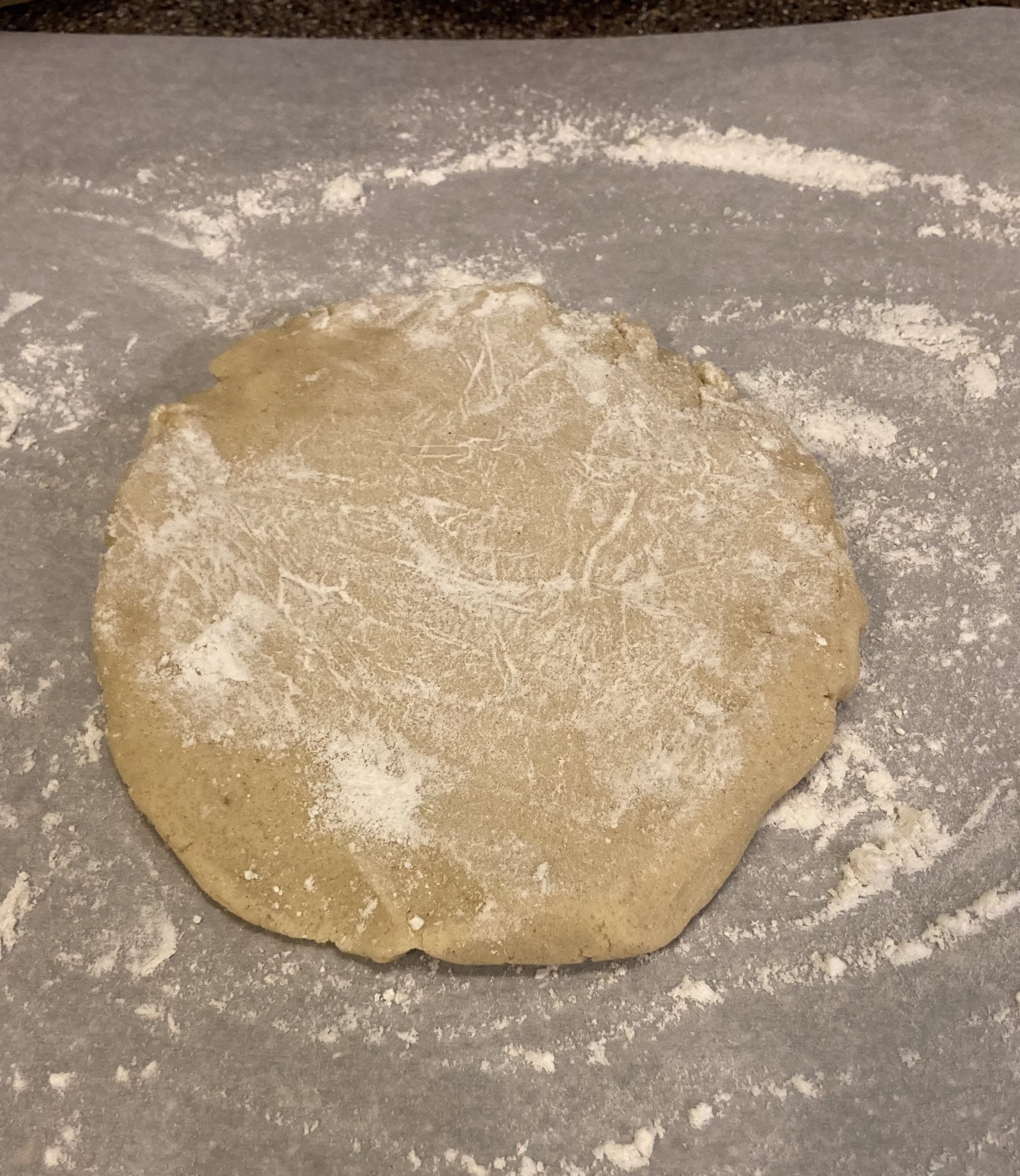 Preheat oven to 375℉. Line a cookie sheet with a silpat or with parchment paper that is cut to the size of the pan. Lay a large piece of parchment paper on the counter and dust with gluten-free flour blend. Place one flattened disc on the parchment paper and lightly dust the disc with gluten-free flour. Cover the disc with a piece of plastic wrap that is cut to about the same size as the parchment paper. Roll the dough out evenly to about 1/4” thickness.