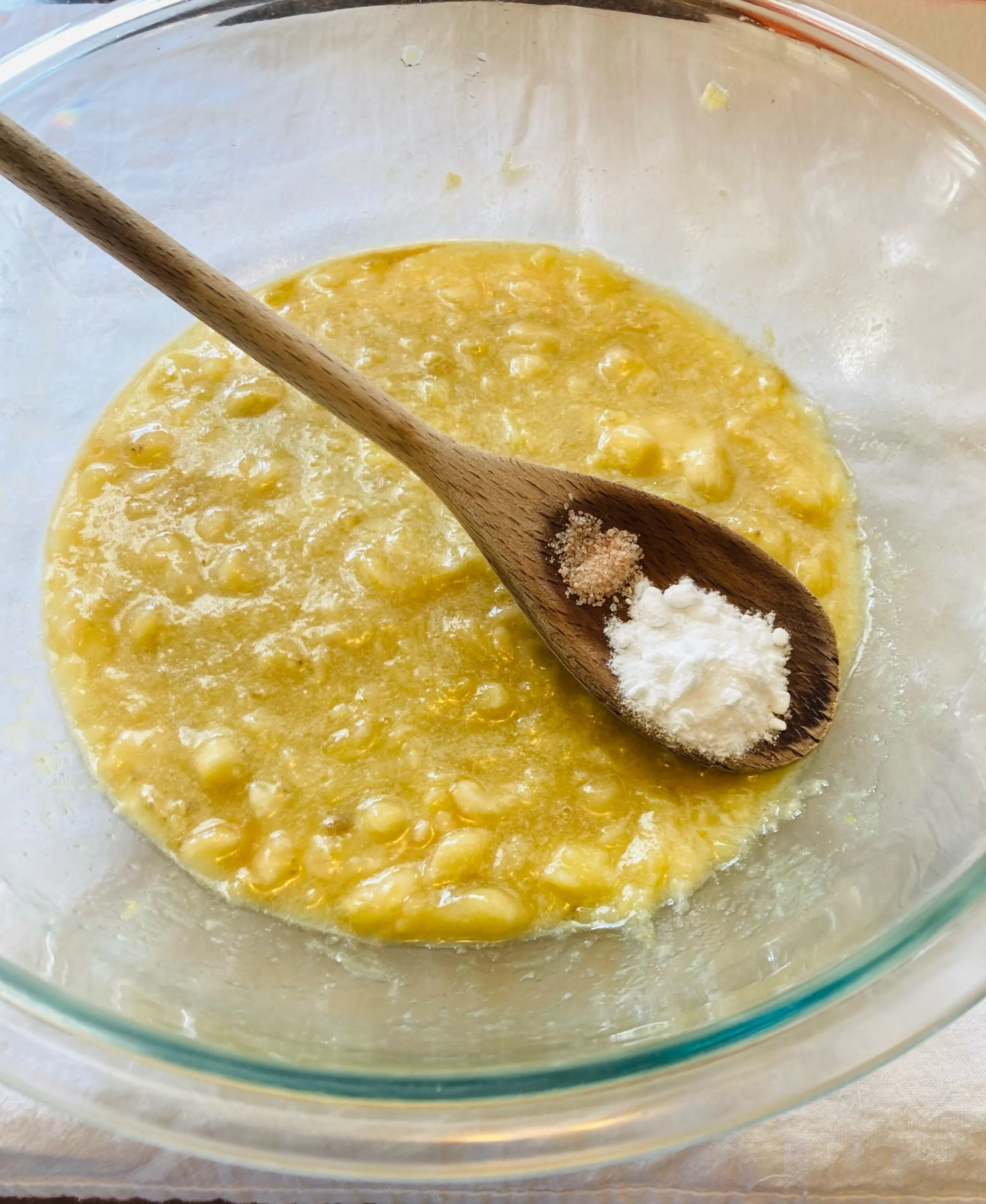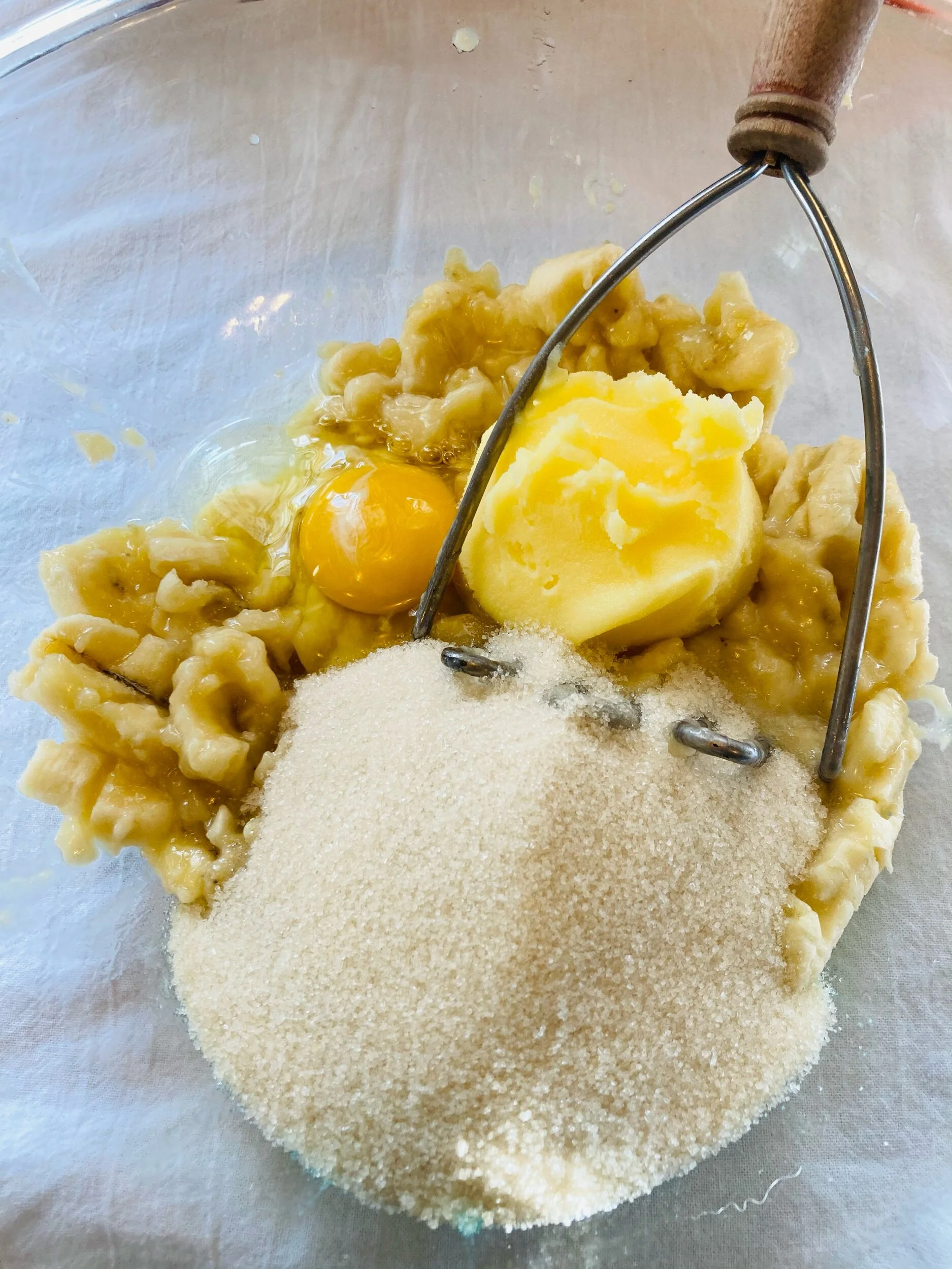 - Add ghee (or butter or margarine) to mixing bowl and continue mashing the banana mixture.