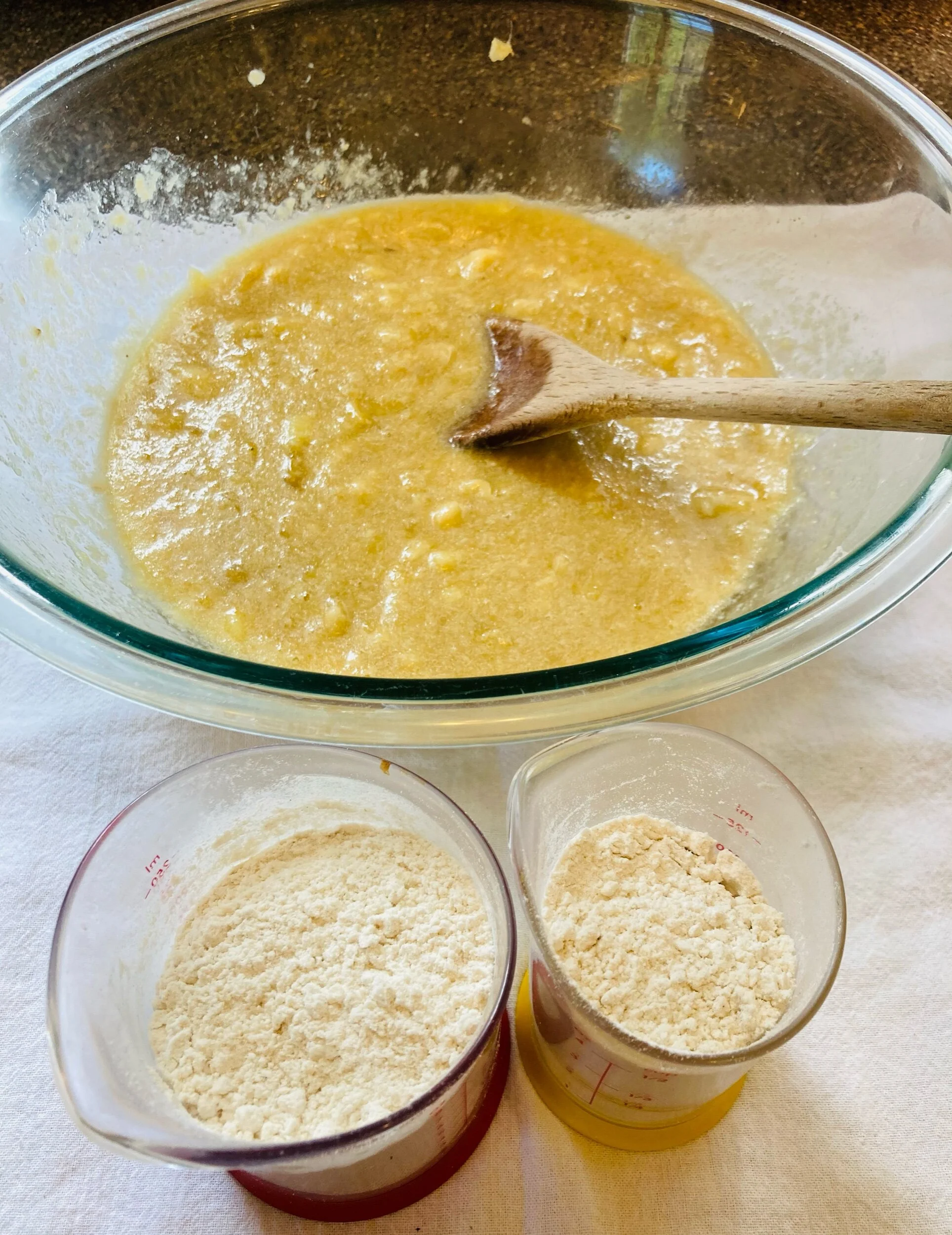 - Add the flour and xanthan gum (if not in your flour blend) and mix until everything is well combined. The bananas will make the batter appear lumpy.